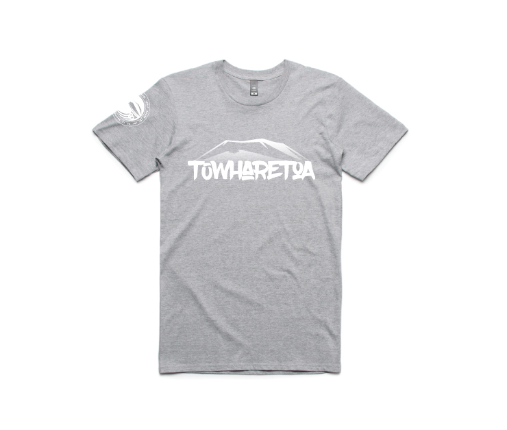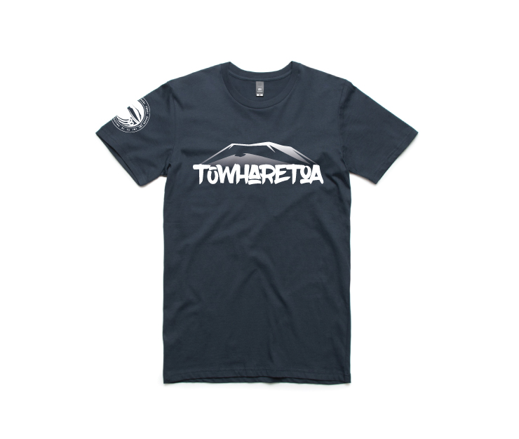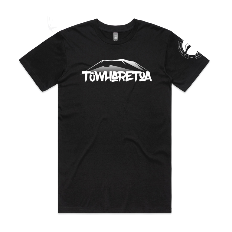 This was specifically designed for our Tuwharetoa merchandise clothing line. The word Tuwharetoa with the maunga Pihanga, Tongariro, Ruapehu and Ngauruhoe in the background.